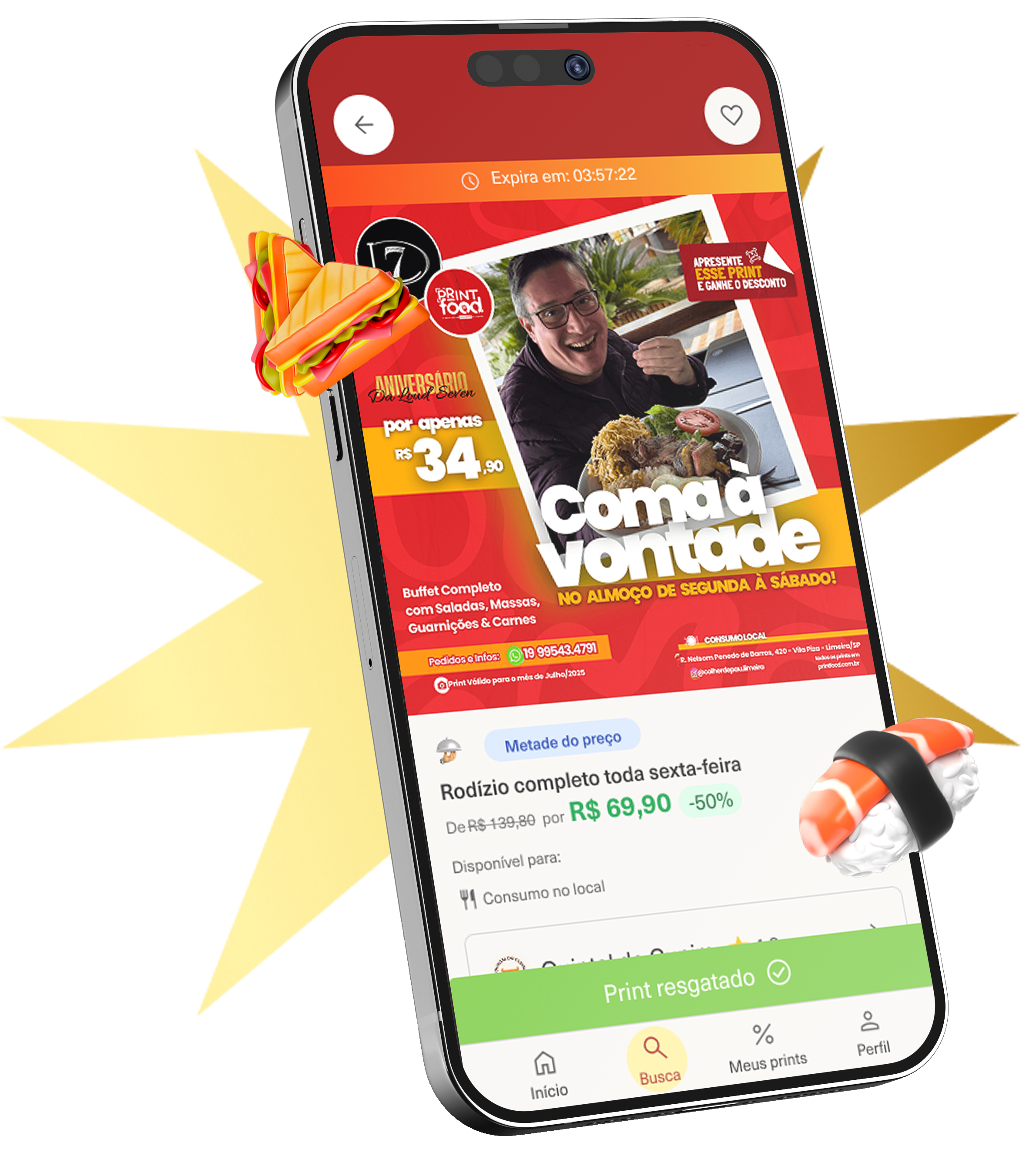 O PrintFood Club foi feito para quem quer aproveitar mais pagando menos. Tenha acesso a prints exclusivos, promoções imperdíveis e uma rede variada de restaurantes. Baixe o app e aproveite agora mesmo!