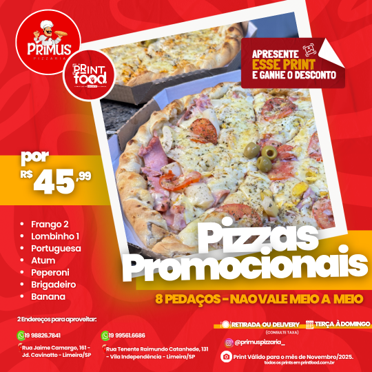 PIZZAS PROMOCIONAIS - Pizzas promocionais, frango 2, portuguesa, lombinho 1, atum 1, pepperonni, brigadeiro e banana